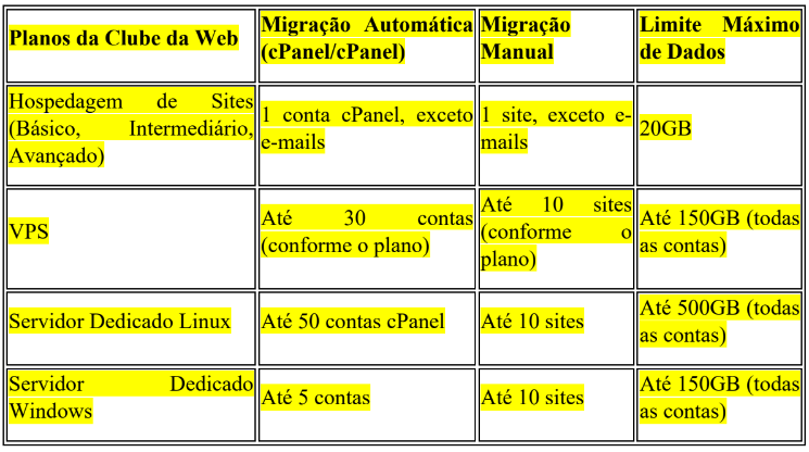 A Clube da Web oferece migração sem custos para novas contas adquiridas nos últimos 30 dias. Esta gratuidade é válida somente para o primeiro pedido de migração e para contas que foram transferidas de um plano de Hospedagem de Sites para um Servidor VPS.